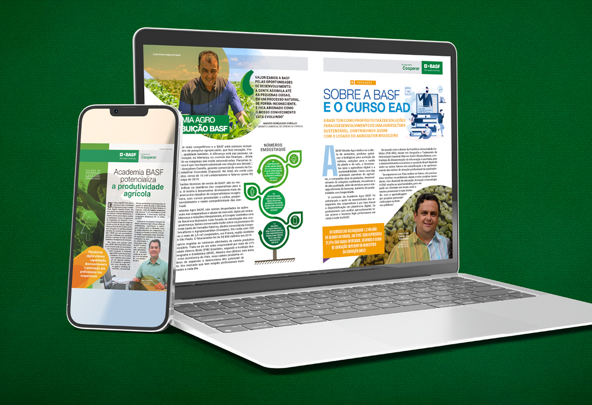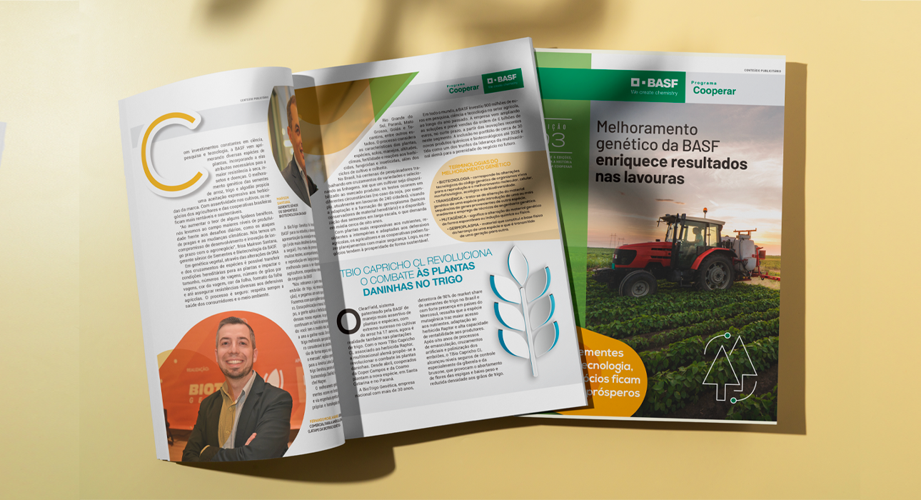 Para fortalecer a conexão entre a marca e o cooperado no campo, a BASF contou com a expertise da MundoCoop MediaLab na criação de um caderno especial dedicado ao programa Cooperar. O projeto reuniu conteúdo editorial exclusivo, linguagem acessível e um projeto gráfico pensado para valorizar as histórias, iniciativas e soluções voltadas ao dia a dia dos cooperados.